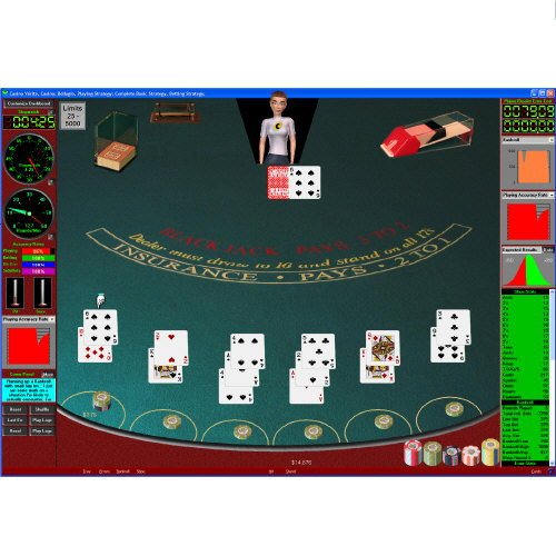 Blackjack practice software. This is the new Version 5.6. Rated the best BJ game by Blackjack Forum Magazine, Dalton's BJ Review, BJ Confidential Magazine & Win Magazine. Over 500 parameters (trillions of combinations), Very simple to extremely complex strategies supported. Casino Data Base with 1170 rule sets at 740 real casinos. Real shuffle, expert methods, casino heat, hole-carding, 37 drills, ultra-realistic 3D casino play using actual photographs of professional casino equipment. 24 lesson Basic Strategy and card-counting tutorials included. Maps of LV, AC and 17 states showing casino locations, 120 page manual. Over 400 card counting tables. Strategies supported include those of Wong, Vancura & Fuchs, Snyder, Carlson, Humble, George C., Renzey, Stricker, Shackleford, and Canfield by permission of the authors. New Blackjack games are supported, like Over/Under13, Red/Black, Double Exposure, Royal Match, Bust Out, Super 7's, Spanish 21, SuperFun 21, 21 Madness, Lucky Ladies, Blackjack Switch, Seven & 1/2 and many others. Extensive logs, graphs and statistics using a modern relational database. Create your own custom bonuses. Deck Biases - Practice with a game is slow because 95% of hands are easy. Six kinds of deck biases are optionally added to force more difficult hands. The game adapts to your errors making better use of your time. Realistic Blackjack features are supported, like tipping, face up or down dealing, players coming and going, and the dealer playing for you in obvious situations. Shuffle-Tracking add-in and high-speed simulation with 60,000 stats and index generation and optimal bet calculation also available in add-in products. This software is mentioned in 26 books. Note: This is the full Version 5.6 edition.