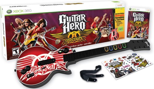 Guitar Hero Aerosmith Bundle X360. Contains a copy of the game a wireless Guitar Hero 3 guitar an Aerosmith guitar sticker sheet an Aerosmith Road Book with behind the scenes pictures and stories stories of their years on the road and an exclusive Aerosmith faceplate.