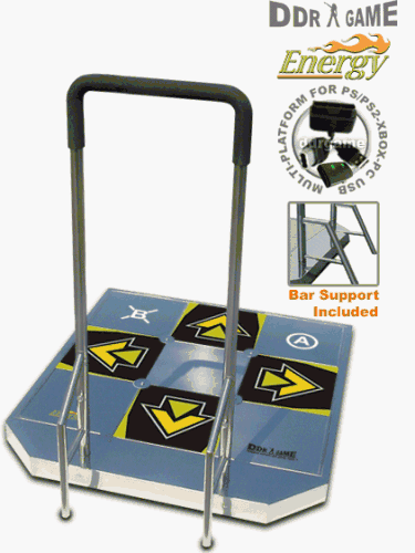 DDRGame is pleased to announce the Energy Metal Dance Pad with Handle Bars. You have never seen anything like the Energy Metal Dance Pad before. The Energy Metal Dance Pad features the super-sensitive-definetely-no-more-delay technology with our brand new look and offers Three-in-One multi-platform plug that works flawlessly with the PS One, PS2,XBOX, and PC/Mac via USB. The Energy Metal Dance Pad is also compatible with the PS3 or the Wii/Gamecube with an optional adapter. The Energy Metal Dance Pad features recessed arrow buttons that accurately recreate the look and feel of an arcade platform, and they let you know exactly where you are on the pad at all times. From complete novices to experienced experts, you can now epxerience skill levels that can match your abilities. Whether you are competing against the challenges of the game or you are seeking particular opponents to match your wits and dexterity, the Energy Metal Dance Pad will provide you with a completely new and rich experience.